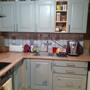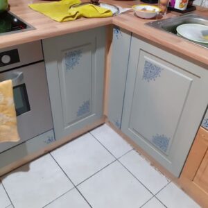 Németh Márti HH fárdat zöld és Budapest kék krétafesték segítségével újította meg konyháját. Először lefestette Budapest kékkel, utána ráfestette a fáradt zöld színt, majd a kopottas hatásért itt-ott visszacsiszolta a bútort, így előjött a Budapest kék alapszín. Végül stencil mintával is díszítette, amelyet szintén Budapest kékkel vitt fel. Nagy gratuláció ehhez a teljesen egyedi és szép munkához! Köszönöm a visszajelzést és a képeket!