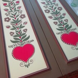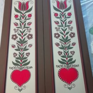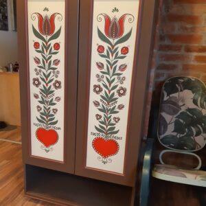 A megrendelők megálmodtak egy szekrényt, amit az Asztalos Sopron elkészített, Helart lefestett és Katkaringo díszítette népi, tulipános mintával.