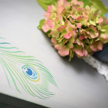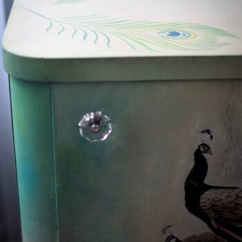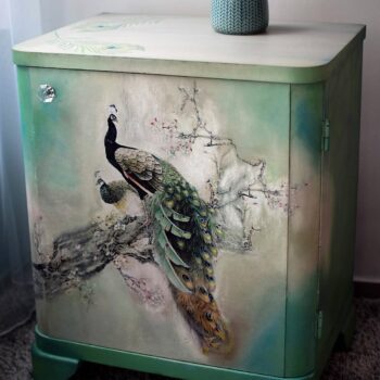 A kisszekrényt a HH Képtranszfer gél segítségével képtranszfer technikával és legalább 15 féle színű HH krétafestékkel, stencilezéssel és pittorico-zással varázsolta át sok-sok órán keresztül. Beletette szívét, lelkét, ami meg is látszik az alkotáson. Végül HH Matt Bútorlakkal zárta.