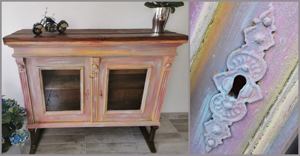 Felhasznált anyagok: HH Vintage Krétafesték ekrü, rezeda sárga, jégzöld, menta, vintage rózsa, meggypiros, púder, shabby chich rózsaszín... majd a végén HH Világos bútorwaxxal zárta a felülete...