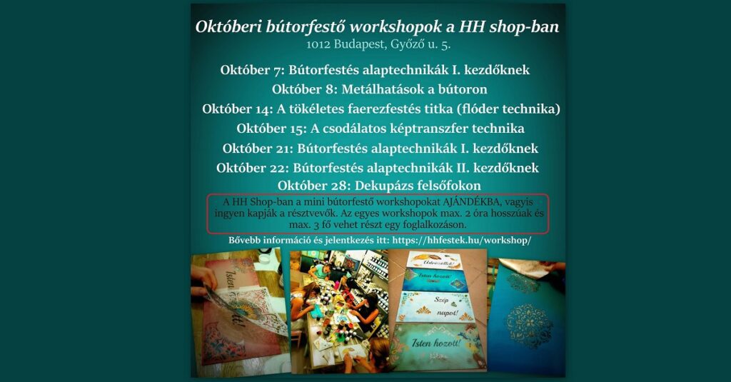 A HH Shop-ban a mini bútorfestő workshopokat AJÁNDÉKBA, vagyis ingyen kapják a résztvevők. Az egyes workshopok max. 2 óra hosszúak és max. 3 fő vehet részt egy foglalko...